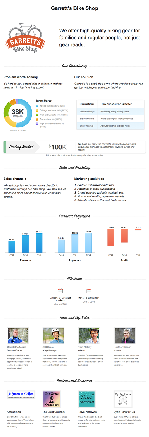 LivePlan gets your clients started on a simple, lean, one-page business plan. View an example of LivePlan's one-page pitch. Use this as a springboard to quickly understand your clients' businesses. If you use the Business Model Canvas, LivePlan's one-page pitch is a great next step.