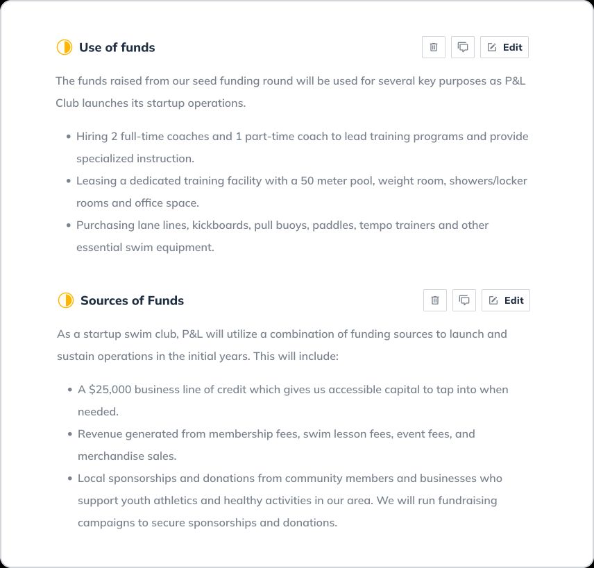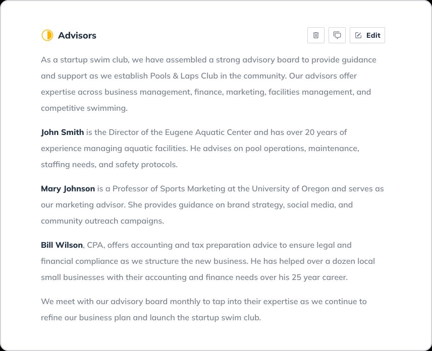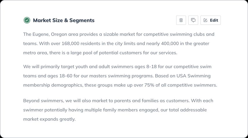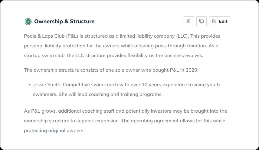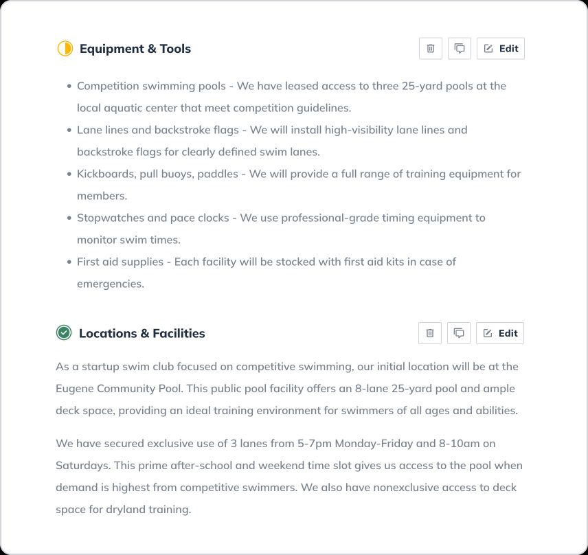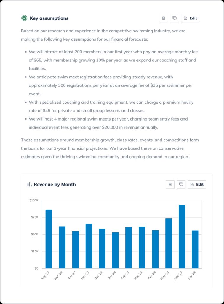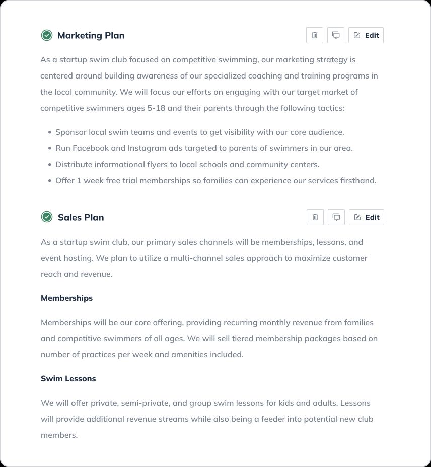 Let’s walk through writing a detailed business plan step-by-step and explore an example of what a finished business plan (for a local swim club Pools & Laps) built with LivePlan’s business plan builder looks like.