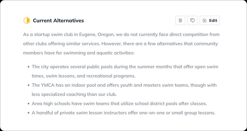 Every business has competition, so don’t leave this section out. You’ll need to explain what other companies are doing to serve your customers or if your customers have other options for solving the problem you are solving.