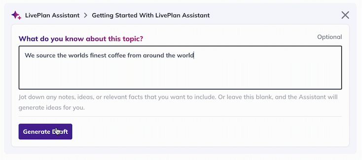 Now, just jot down any notes, ideas, or relevant facts that you want to include in your plan. If you have no ideas, you can leave this blank, and the Assistant will generate some for you. Once the LivePlan Assistant generates the text, you’ll have the option to insert it into your plan, edit your original instructions, or have it come up with other ideas.